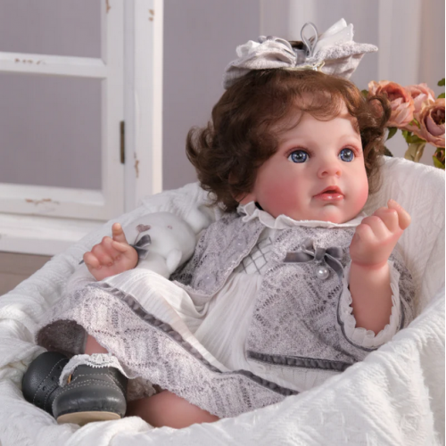 Sweet, Lifelike Expression: Hand‑painted sparkling eyes—framed by softly rooted dark brown curls—gaze out with tender innocence. Rosy cheeks and a gently parted pout capture the irresistible sweetness of a real infant.
